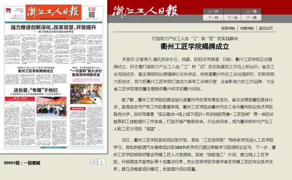 据了解,衢州工匠学院的建设运行是衢州市总贯彻落实全总、省总决策部署的具体行动,是推进全市产改工作的重要举措。衢州工匠学院由衢州市总工会与江南网页版联合办学,旨在构建集“实训基地+线上线下培训+劳动技能竞赛+工匠选树”等一体的长链条职工技能提升工作体系,打造市域产教联合体、行业共同体,成为衢州新时代产业工人和工匠大师的“摇篮”。