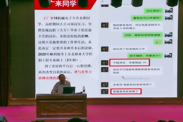 汤老师从学历提升的重要性、专升本的优势、特点、报考条件、报考建议等几个方面来进行说明,从近几年专升本政策的变化及未来的发展趋势进行讲解,通过对专升本历年数据对比,综合分析了专升本考试内容、招考院校、招生计划等情况。除此之外,汤老师分别介绍了英语和数学两个学科相关学习方法。他鼓励同学们提高学历,尽早规划未来。