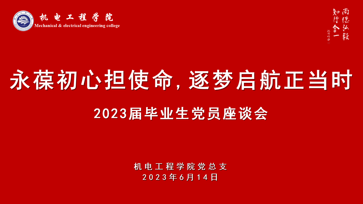 为做好2023届毕业生党员相关工作,发挥共产党员在毕业生文明离校中的先锋模范作用,激励毕业生党员坚定信念,铭记神圣使命,赓续红色血脉,激扬青春担当,以良好的精神风貌踏入新的征程。机电工程学院于2023年6月14日10:00在机电303会议室举行“永葆初心担使命,逐梦启航正当时”2023届毕业生党员座谈会。机电工程学院党总支书记朱峻、机电工程学院副院长党总支委员徐文俊,组织员吕云鹏及毕业生党员参加了座谈会。座谈会由吕云鹏主持。