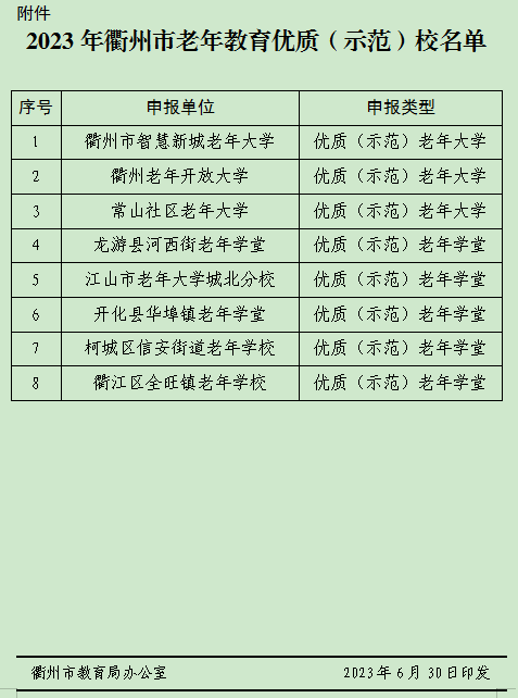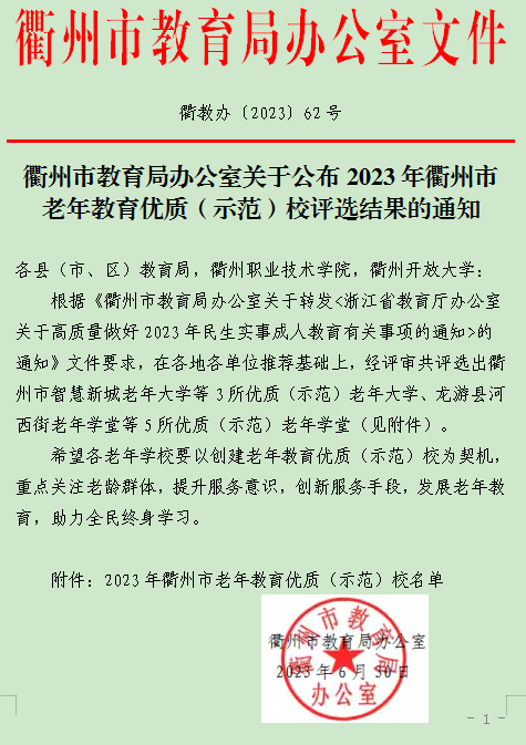 6月30日,衢州市教育局办公室公布2023年衢州市老年教育优质(示范)校评选结果,我校“衢州市智慧新城老年大学”被评为优质(示范)老年大学。