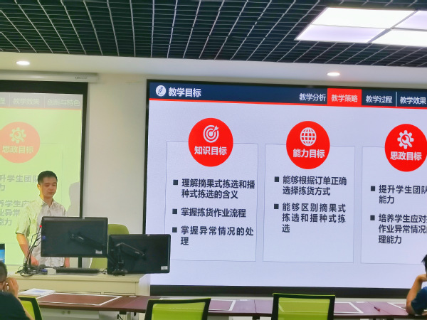 校内专业教师杭钰玲、周银龙、朱虹影、傅子刚等4位教师分别对《管理基础》、《连锁企业物流管理》、《直播营销》、《大数据金融》等课程进行了说课。