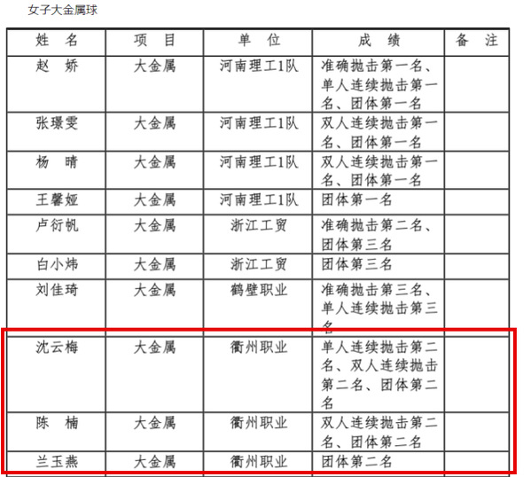 近日,国家体育总局小球中心、中国掷球协会发布了2023年国家队人才备选库第二批入库名单的通知,我校沈云梅、陈楠、兰玉燕等七位同学成功入选运动员人才备选库,校地掷球队教练郑胜燕、张洪柱老师成功入选教练员人才备选库。