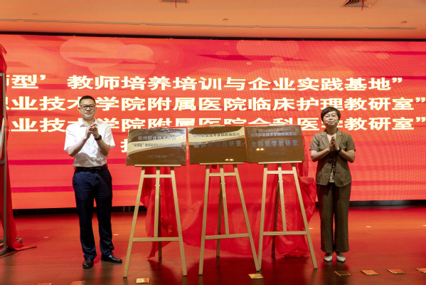 姚水洪与蓝建芳共同为“双师型教师培养培训与企业实践基地”、“江南网页版附属医院全科医学教研室”、“江南网页版附属医院临床护理教研室”揭牌。