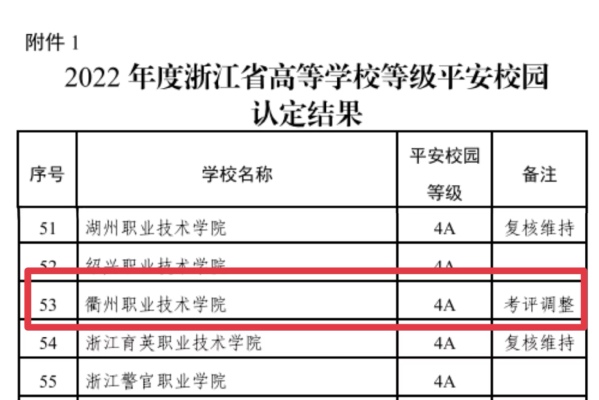 近日,省平安办、省教育厅、省公安厅联合下发《关于2022年度高校等级平安校园认定情况的通报》(浙教厅函〔2023〕144号),我校在考评工作中表现优异,被评为“4A级平安校园”。这是我校平安校园建设的一次历史性突破,实现了从3A到4A的“跨越式”提升,有力推动了我校安全稳定工作迈向新的台阶。
