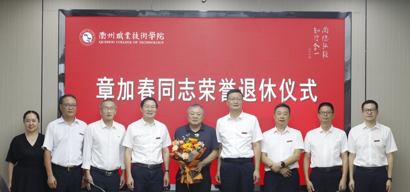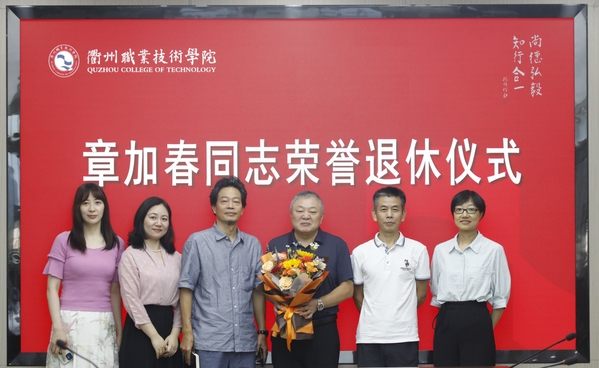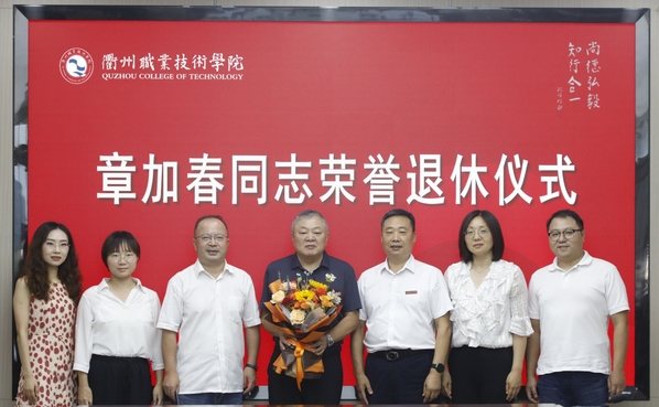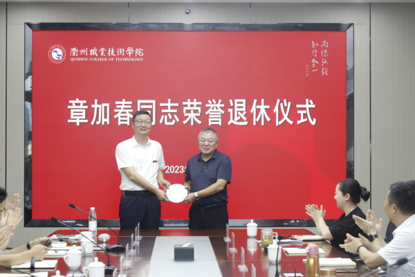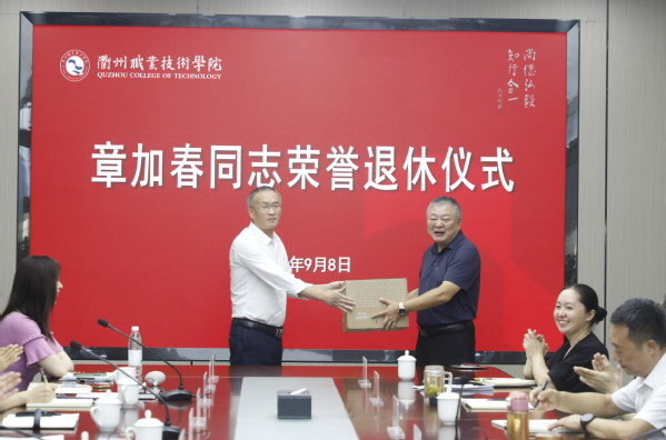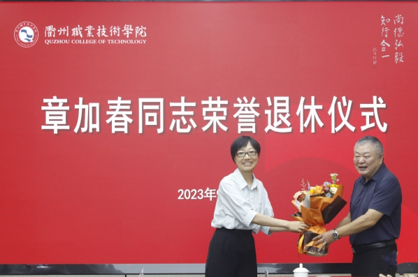 徐须实代表校党委向章加春同志光荣退休表示热烈祝贺,对章加春同志多年来为学校发展作出的贡献表示感谢,并表达了对他的真诚敬意和美好祝福。他赞扬章加春同志讲政治、顾大局,定位准、做事实,讲纪律、守规矩,为人、做事的良好风范,将留存在每个与其共事过的衢职人记忆中,记载在学校的发展历程之中。他希望章加春同志退休后保重身体、快乐生活,坚持锻炼、放松心态,快乐开启第二春!坚持学习,与时俱进,做一个与时代同步的退休达人。发挥优势,老有所为,继续关心支持学校的建设发展,为学校“双高”建设增添正能量、再作新贡献。