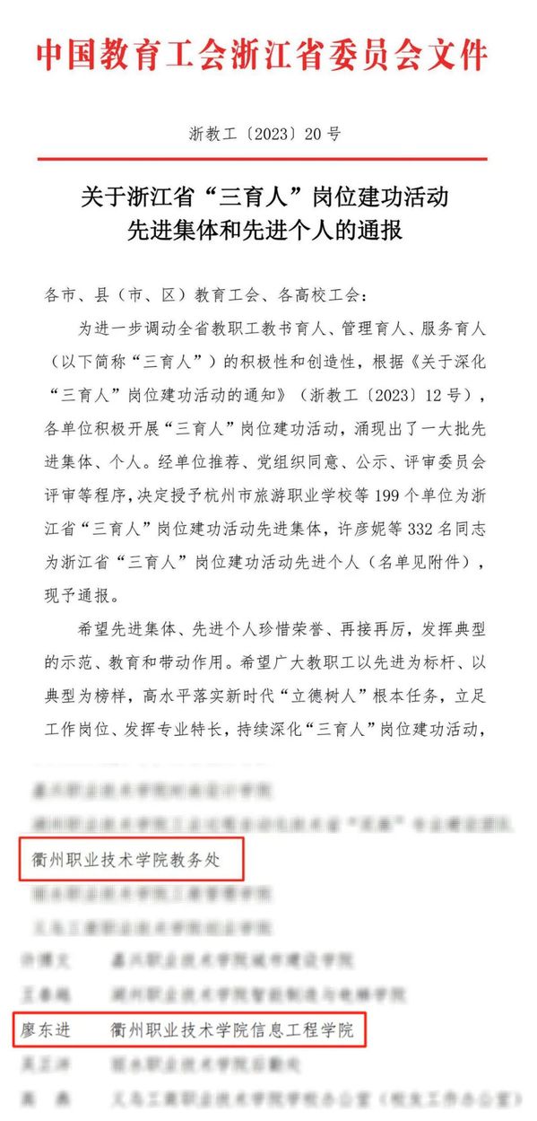 近日,浙江省教育工会发布《关于浙江省“三育人”岗位建功活动先进集体和先进个人的通报》,我校教务处荣获省“三育人”岗位建功活动先进集体、信息工程学院廖东进荣获省“三育人”岗位建功活动先进个人荣誉称号。