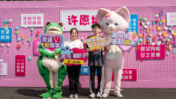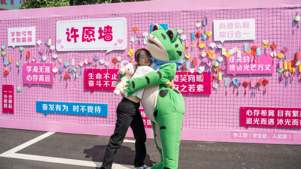 心理协会志愿者穿着玩偶服,化身为“拥抱使者”,为新生送上爱的抱抱,鼓励大家在衢职院从心出发、乘风破浪。