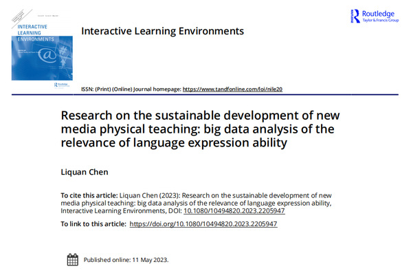 近日,我校文化旅游学院博士陈力全在国际权威期刊《互动学习环境》(Interactive Learning Environments,影响因子4.965,SSCI一区)上发表了题为Research on the sustainable development of new media physical teaching: big data analysis of the relevance of language expression ability的学术论文。