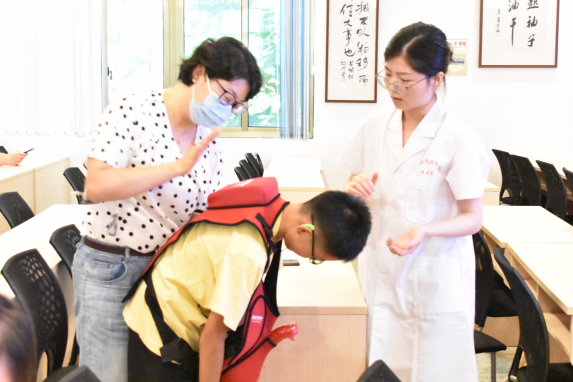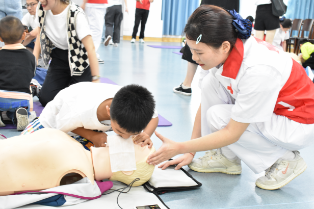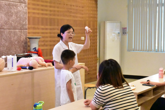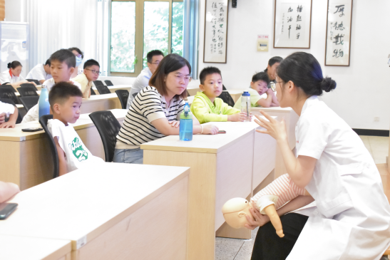活动第一环节,老师用通俗易懂的语言为孩子们讲解了什么是急救、如何拨打急救电话、气道异物阻塞怎么办等知识,并深入浅出的介绍海姆立克急救法,老师与志愿者结合模型形象的展示了成人海姆立克急救手法以及婴幼儿海姆立克急救手法等。