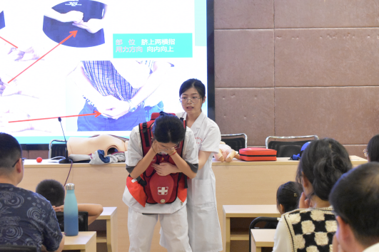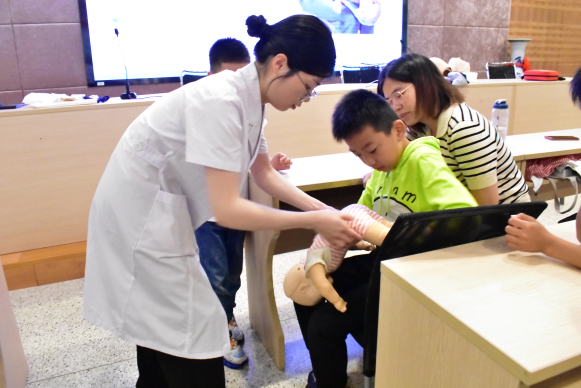 本次活动面向来自衢州市各小学1-6年级的学生,主讲老师是医学院王依维老师。王依维以知识讲解加互动体验的方式为孩子们生动具体地科普了噎食、溺水、中暑、烫伤、外伤出血等情况的急救方法,并学习体验心肺复苏、海姆立克急救法、止血固定包扎技术。