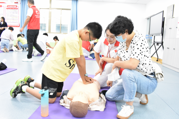 活动第二环节,老师结合紧急救援过程中遇到的典型案例,用生动的语言和规范的动作为大家讲解心肺复苏。老师利用现场的各类模型,与孩子们互动,激发了孩子们的好奇心和求知欲。小朋友和家长进行心肺复苏实操,学生志愿者一对一指导,小朋友们一边操作,一边学习,兴趣极大,收获更大。