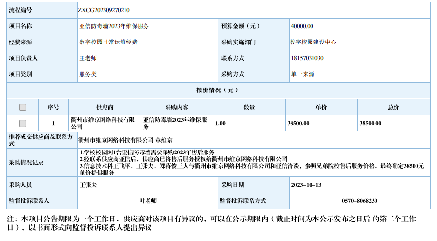 江南网页版亚信防毒墙2023年维保服务自行采购信息公示