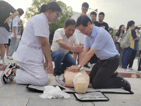 活动现场,校党委书记徐须实与同学们一起体验急救操作。
