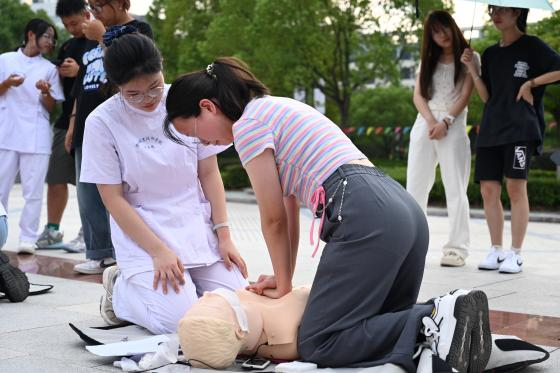 在思齐广场的另一角,志愿者们针对心脏骤停、气道梗阻窒息等突发事件,对同学们进行心肺复苏(CPR)和海姆立克腹部冲击法的一对一教学。为了更好地提高同学们的参与积极性,同时开展了CPR操作计分挑战赛。