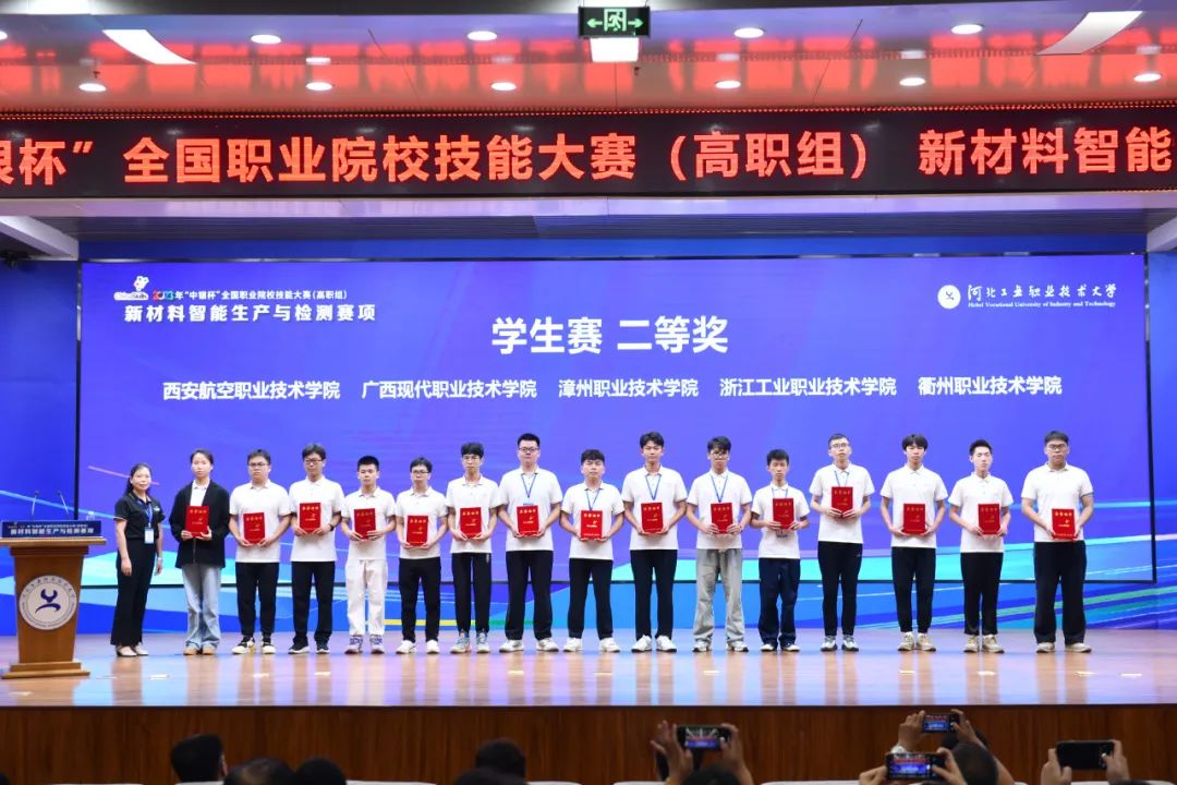 9月22日—25日,全国职业院校技能大赛(高职组)“新材料智能生产与检测”赛项在河北工业职业技术大学成功举办。我校教师团队邵思程、林钰珍、舒慧建在该赛项中荣获二等奖,同时,由机电工程学院邵思程、朱峻老师指导的学生团队丁伟良、金天、吴剑也荣获学生组二等奖。