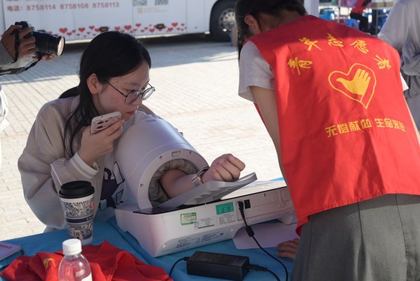 符合献血条件的同学无惧疼痛,满怀热情,一个个撸起袖子,露出臂膀,开始献血。