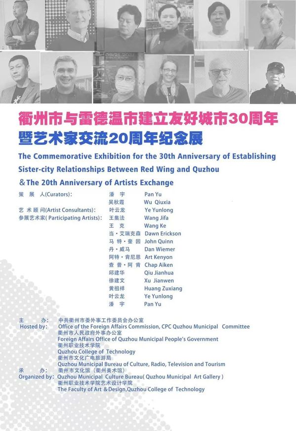 11月5日,衢州市与雷德温市建立友好城市30周年暨艺术家交流20周年纪念展在市美术馆隆重开幕。衢州市人大常委会副主任、市委秘书长郑河江,美国雷德温市姐妹城市委员会主席彭涛,市人大教工委专职委员、二级调研员周立年,市委外办专职副主任彭力,市文化广电旅游局副局长蓝啸鸣,美国雷德温市艺术家当·艾瑞克森(Dawn Erickson) 、马特·奎因(John Quinn )、丹·威马(Dan Wiemer) ,我校党委书记徐须实出席。衢州市艺术家代表,我校国际交流合作处、艺术设计学院师生代表参加了开幕式。