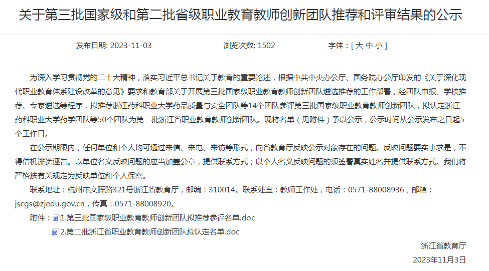近日,浙江省教育厅公布了第二批浙江省职业教育教师创新团队名单,以我校副校长姚水洪教授为团队负责人的护理专业教师创新团队获批立项。