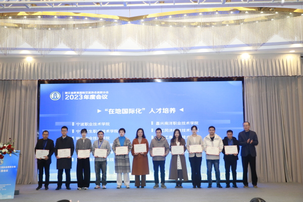 浙江省教育国际交流协会高职分会副会长、杭州职业技术学院副校长楼晓春宣布“在地国际化”人才培养工作典型案例,宗瓦为执笔人颁发证书。