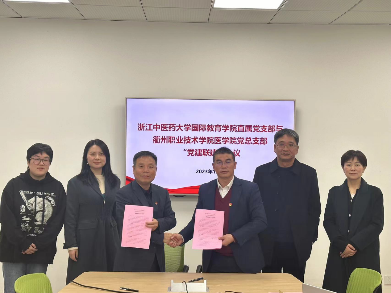 随后,黄在委书记代表浙江中医药大学国际教育学院直属党支部、余文富书记代表医学院党总支共同签订了党建联建协议书。