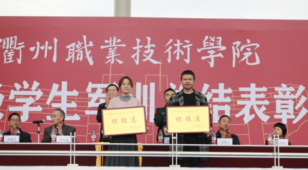 姚水洪宣读2023级学生军训工作优胜集体和先进个人名单,校领导和承训部队领导为2023级学生军训工作优胜集体和先进个人颁奖。
