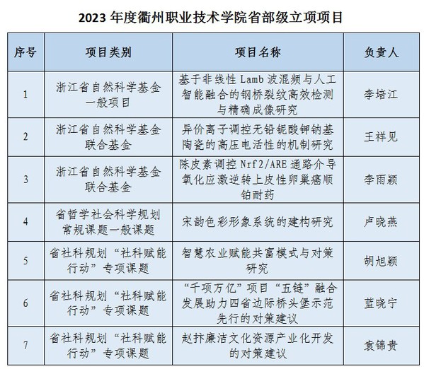 日前,浙江省自然科学基金委员会办公室公布了2024年度浙江省基础公益研究计划项目的立项名单,我校共获立项3项基金项目,其中基金一般项目1项、联合基金项目2项。立项数量位居全省高职院校中的第2名,获历史性突破!