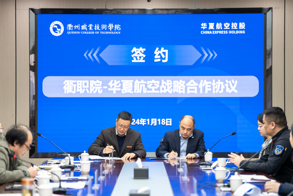 1月18日,衢职院-华夏航空控股战略合作协议签约暨产业学院成立揭牌仪式在我校举行。华夏航空控股(深圳)有限公司总裁张工,华夏航空控股(深圳)有限公司副总裁、华夏蓝翼教育科技(衢州)有限公司董事长吴成富,我校党委书记徐须实,党委副书记、校长吕延文,党委委员、副校长姚水洪参加,签约仪式由校党委副书记何百通主持。