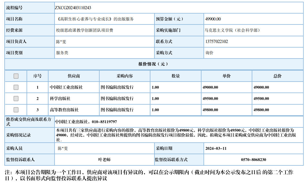 江南网页版《高职生核心素养与专业成长》的出版服务自行采购信息公示