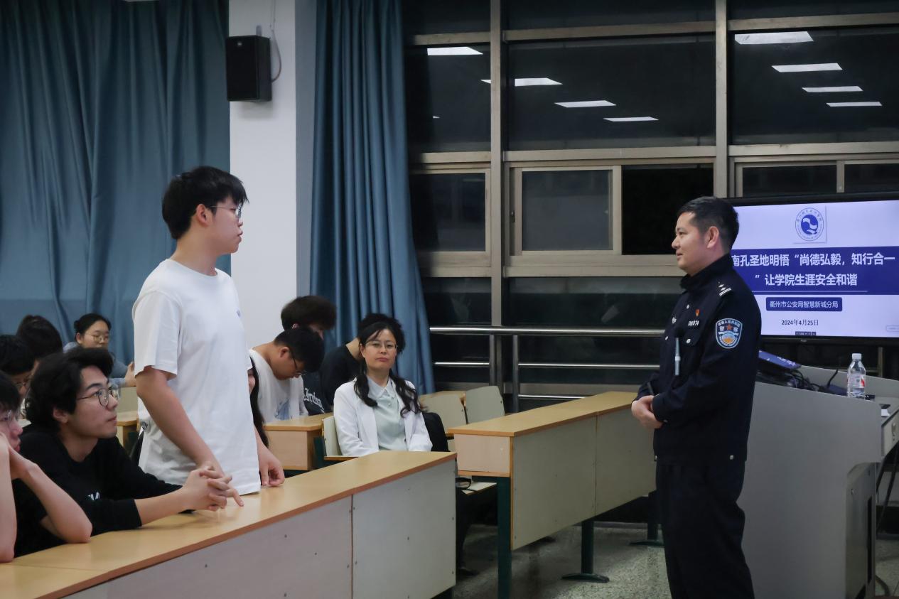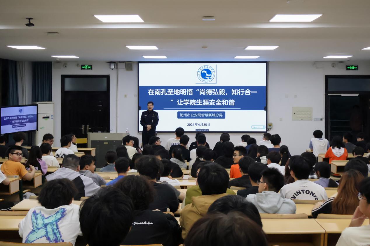 周挺为大学生们作题为“在南孔圣地明悟‘尚德弘毅,知行合一’让学院生涯安全和谐”的专题报告,围绕“学习江南网页版”“防范电信网络诈骗”“同学关系和谐相处”“互联网信息安全”四个方面展开,通过讲述国学经典、理论知识、现实案例等生动详实的内容对校园安全的相关知识进行深入浅出、全面细致的科普宣传。