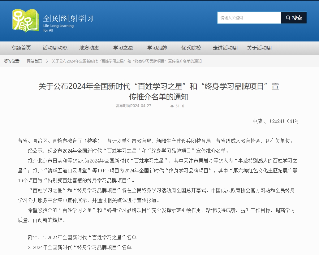 宣传推介“终身学习品牌项目”是教育部、中央宣传部、民政部(全国老龄办)、文化和旅游部、中华全国总工会联合举办的全民终身学习活动周的一项重要内容。2024年全民终身学习活动周全国总开幕式于4月26日在辽宁省沈阳市举行,会议发布了“全民终身学习沈阳倡议”,公布了194位全国新时代“百姓学习之星”和191个“终身学习品牌项目”宣传推介名单。教育部副部长吴岩出席开幕式并讲话。