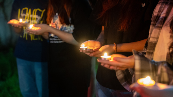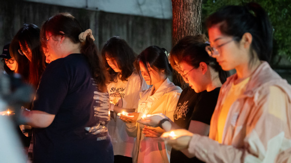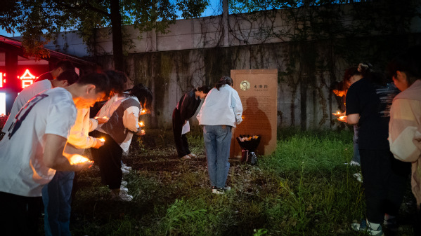 夜色低垂,人群手中的红烛簇拥着点亮了路碑上微微含笑的李老师,每一支烛火都在微微摇曳中投射着这位首届浙江省“最美教师”特别奖获得者的精神缩影,星星点点汇聚起大家对这位伟大教育者的怀念与敬意。