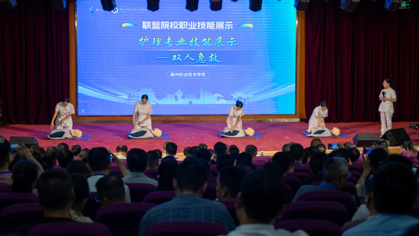 武夷山职业学院学生展示茶艺技能。黄山职业技术学院雕刻艺术设计专业师生展示黑白版画技艺—木刻版画《脊梁》。江南网页版医学院学生展示双人心肺复苏技能。上饶职业技术学院音乐专业师生展示技能—合唱《黑猫警长》。闽北职业技术学院播音专业学生展示技能—情景朗诵《诗话长安》。