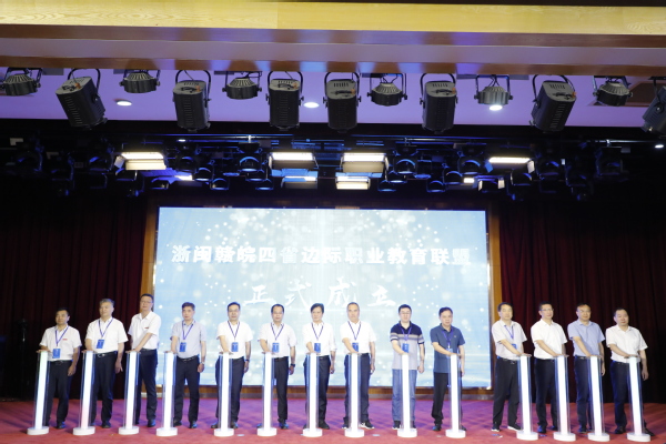 衢州市教育局副局长姚文湧,南平市教育局副局长李小勇,上饶市教育局副局长郑乐春,黄山市教育局代表吴建平,衢州市人社局副局长徐竹良,上饶市人社局副局长王良福,南平市人社局职建处处长刘超,黄山市人社局二级调研员范琪,以及联盟理事长、副理事长共同开启四省边际职业教育联盟。