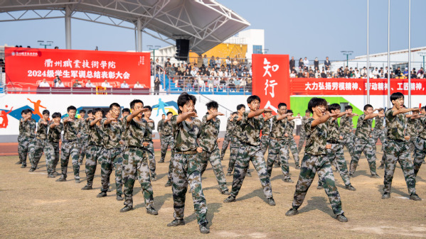 女生匕首操、男生擒敌拳表演动作干脆利索、气势如虹!方寸之间将衢职学子顽强拼搏、奋勇向前的精神面貌展现得淋漓尽致!