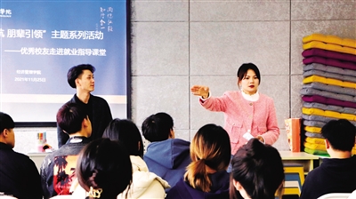 如何千方百计把准新生代员工留在“第二故乡”转化为“自家人”?经济管理学院蒋雪芬创新就业指导课授课形式,从“我讲”到“他说”,引入在衢创业就业的优秀毕业生,听他们“说衢州产业”“说就业政策”,分享衢州爱才、惜才、用才浓厚氛围下的个人成长经历,潜移默化地传播衢州这片热土的吸引力。
