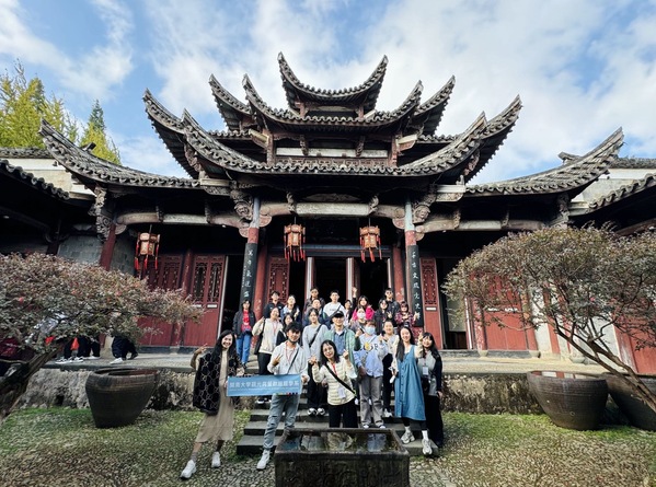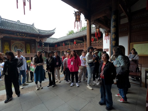 在清漾毛氏文化村,青年师生观赏青砖黛瓦、飞檐斗拱、雕梁画栋,感叹中国古代建筑的精美。
