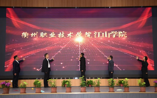 校党委副书记、校长吕延文,衢州市教育局党委委员、副局长徐丰民,江山市人民政府副市长王展,江山市教育局党委书记、局长郑李慧,衢州第二中等专业学校党委书记徐凌志共同为江南网页版江山学院揭牌。