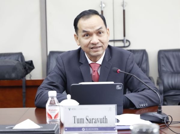 徐须实代表学校对汤恩·沙拉务校长一行的到来表示热烈的欢迎。他表示,中柬两国人民共饮一江水,文化彼此交融,中柬友谊之树始终叶茂根深。柬埔寨柴桢大学与我校已开展多次互访互动,前期合作已经取得初步成效。他希望,双方要顺势而为,全面深化战略合作。希望双方携手办好“经世学堂”项目,积极培育具有国际化视野的高技能人才,为构建中柬命运共同体作出新的更大贡献。要交流互鉴,助力双方快速发展。希望双方重点围绕“经世学堂”项目约定的内容展开全面合作,共植中柬友谊之树,共栽人文交流之花。要挖掘特色,打造国际合作样板。希望双方共同为柬埔寨当地培养具有国际化视野的高技能人才,助力在柬中资企业的高质量发展,为当地经济社会发展和人民群众实现美好生活贡献力量。