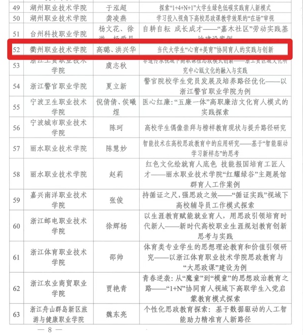 学校将以此次获奖为契机,进一步总结经验、凝练特色、打造品牌,持续推动思政工作守正创新,努力构建更加完善的“大思政”工作格局,为培养担当民族复兴大任的时代新人贡献更多衢职智慧和力量!