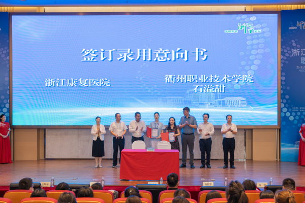 竞赛期间特别组织的就业对接会,吸引了七家省内康养领域头部机构和企业参与,浙江康复医院与石溢甜同学在闭幕式上成功签订就业意向书,这也是我校2026届毕业生第一个签约就业学生。