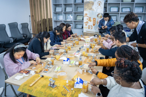 在学校学生创新创业团队“鹿鸣香韵·衢州印”的悉心指导下,他们亲手制作了非遗中药香珠,在馥郁的药香环绕中,团队不仅娴熟地演示了香珠的古法配方、手工打磨与串制技艺,还生动传达了每一道工序所蕴含的中医药“未病先防”的防疫智慧与“闻香祛病”的健康理念,更以流利的英语分享了他们致力于中医药文化创造性转化的创业历程。
