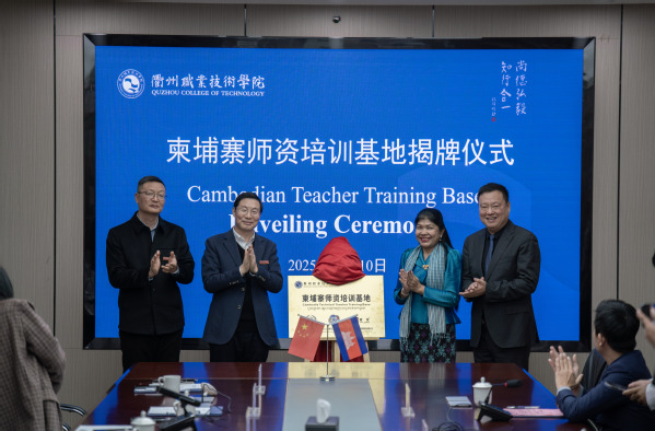 柬埔寨劳工部在我校挂牌“柬埔寨师资培训基地”,伊姆·皮奇玛利卡、徐须实、吕延文、陈传周为“柬埔寨师资培训基地”揭牌。